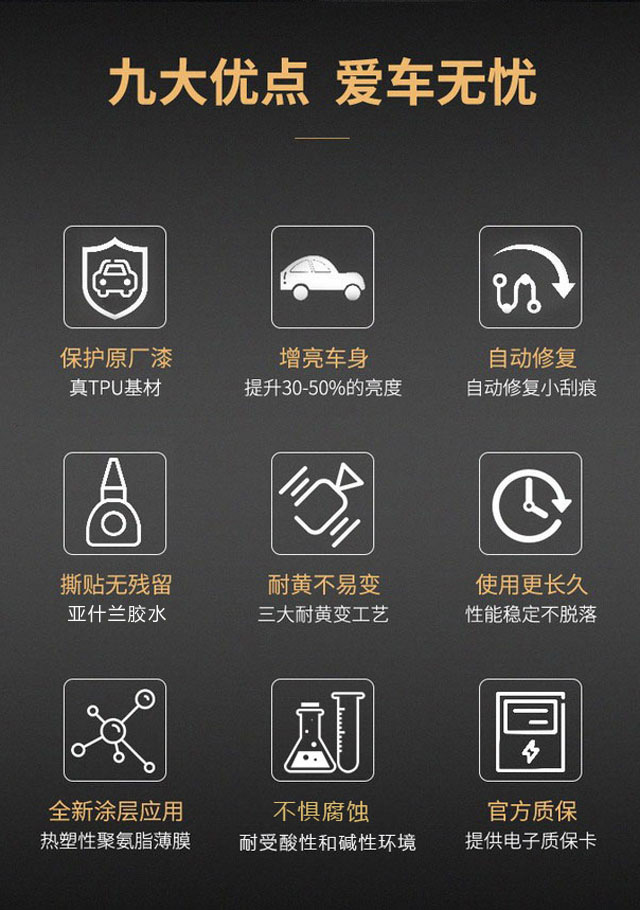 雷佳漆面保护膜经过不断创新,综合了目前漆面保护膜的特性,经过无数次的破坏性实验推出漆面保护膜新品系列,产品不仅具有优秀的抗污能力,而且划痕常温下快速自动修复,达到目前行业较高水平。雷佳漆面保护膜继续坚持创新、全力以赴保证一如既往的卓越品质,为客户提供一流的产品和服务!